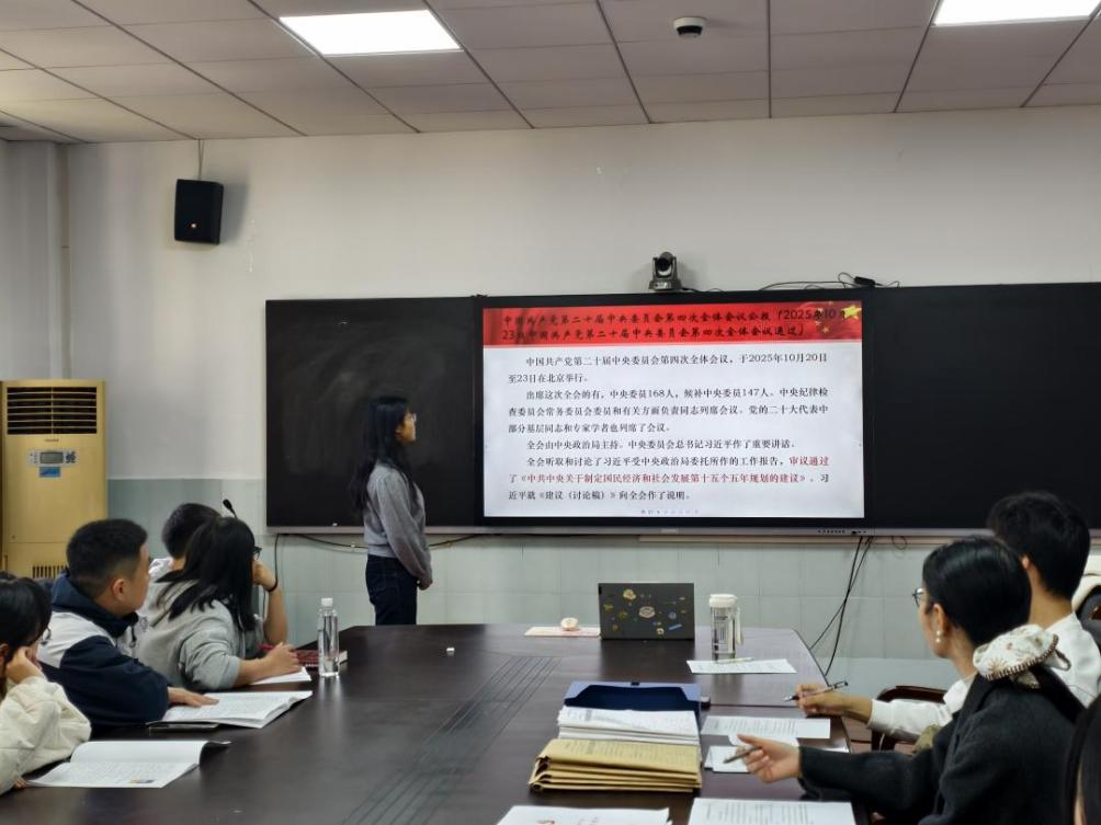11月21日,马克思主义理论研究生党支部召开党的二十届四中全会精神学习暨党员发展会议。纪检委员韩艳领学四中全会公报,解读“十五五”规划核心;支部书记周慧主持完成预备党员接收和转正工作。