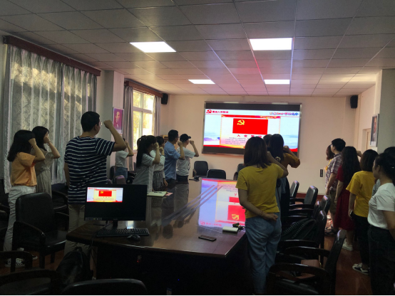 全体党员同志一同重温入党誓词、奏唱国歌并现场交纳党费。大家一起观看了《中华人民共和国中央人民政府成立典礼原始影像》和《纪录·70年》纪录片混剪视频,体会中国共产党领导中国人民走向光明、走向胜利的光辉历程,表达对祖国的热爱和美好祝愿。观看结束后,大家联系日常学习工作实际进行了交流发言及热烈讨论,一致认为作为当代的共产党人,要时刻铭记“不忘初心,牢记使命”的信念,在自己的本职岗位建功立业,为国家的发展建设作出积极贡献。