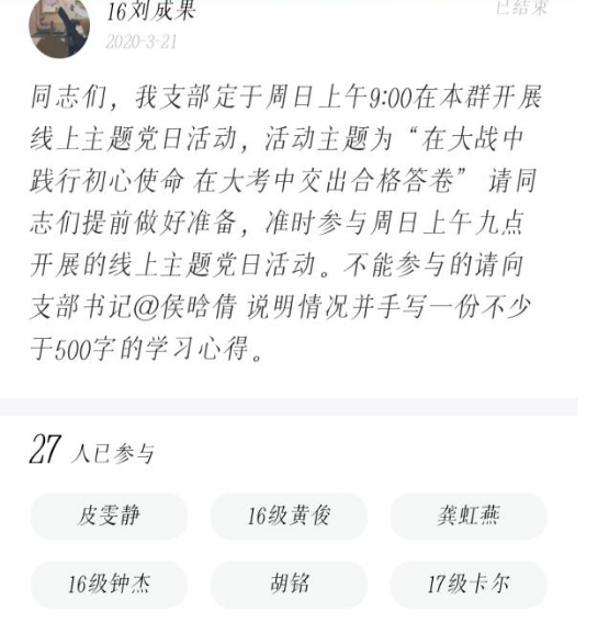 全体党员一同重温入党誓词、奏唱国歌并在线缴纳党费后,活动正式开始。活动第一项,全体党员共同学习习近平总书记在湖北考察新冠肺炎疫情防控工作以及在中共中央政治局常委会会议上的重要讲话精神并交流学习心得。活动第二项,支部党员分享抗疫经历、感受并畅谈对当前疫情、舆情发展趋势的看法。支部党员积极发言,分享参与志愿活动等抗疫经历以及身边人的感人事迹,令人感动。党员们纷纷表达了对党和国家的感激之情,一致认为,当前疫情防控形势发生积极向好变化,取得阶段性重要成果,离不开党和国家的坚强领导以及全国上下和广大人民群众的共同努力。活动第三项,结合本支部实际,16级党员分享考研、求职心得,交流经验。姚远翔、刘成果、陈源等同志分别从考研、考公、求职等方面进行初步介绍并分享经验。同时围绕专硕、少干计划、跨专业考研等问题,16级党员与17级党员展开线上交流。活动第四项,辅导员邹浩老师发表讲话指出,疫情期间,在保障自身安全的前提下,支部党员应服从当地统一安排,积极参加志愿活动、社区防疫等工作,充分发挥一名党员就是一面旗帜的先锋模范作用。