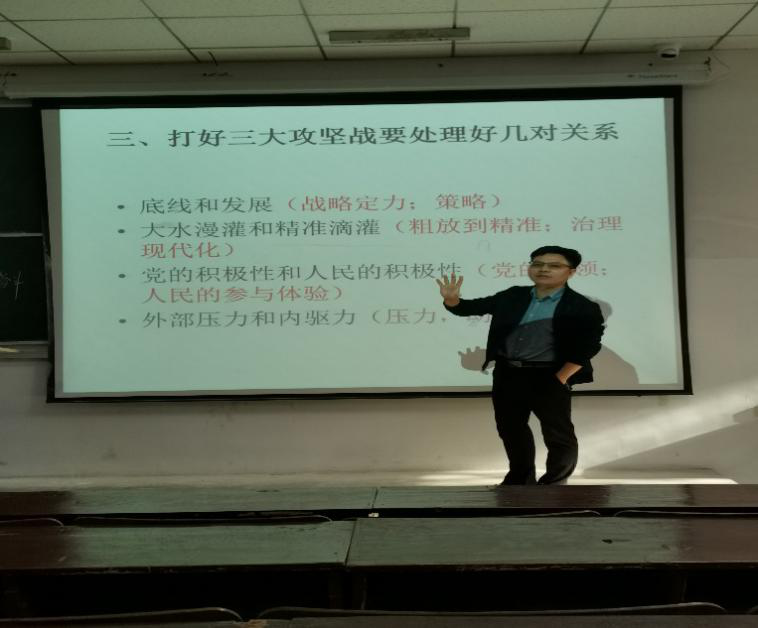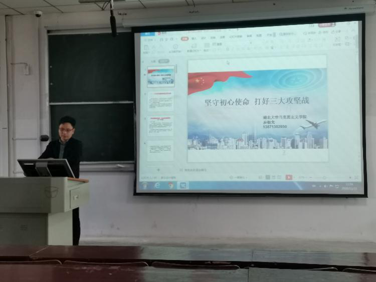 11月11日下午2点,湖北大学马克思主义学院副教授易振龙老师在3号教学楼210课室对马院思想政治教育17、18、19级全体学生开展了《坚守初心报告,打好三大攻坚战》的主题报告。易老师通过“重大风险”、“精准扶贫”、“污染防治”三个方面向同学们讲授三大攻坚战的深刻内容及其重大意义。