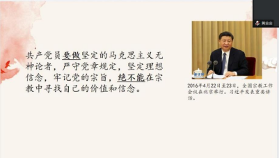 与会党员分别就“共产党员不得信仰宗教”发表观点。王宠表示,党员不仅要在组织上入党,更要在思想上入党,党员信教是政治立场不坚定的表现。支部书记曾沁文总结指出,中国共产党是马克思主义政党,作为一名共产党员,只有树立唯物主义世界观,用马克思主义世界观认识世界、改造世界,才能做一个彻底的无神论者。