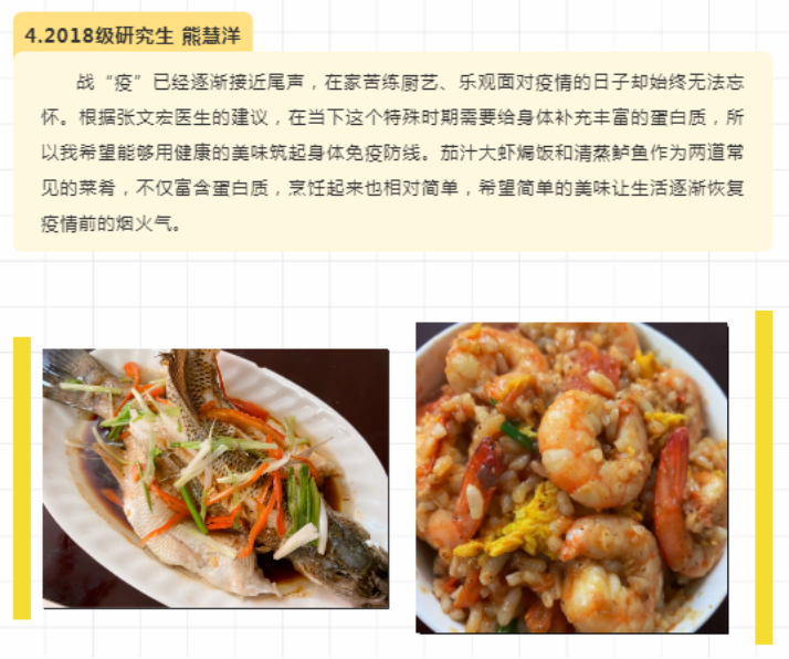 活动通知一经发出,便得到广大同学的积极响应。大家克服疫情期间出行不便、采购食材不方便等实际困难,围绕主题充分发挥自己“厨艺”特长,不仅仅只为比赛,而是浓缩了在疫情防控的特殊日子马院学生为家人奉献的“大餐”。