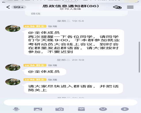 利用QQ群语音,召开2022届毕业生就业考研动员大会,院党委副书记晏妮、2018级思想政治教育班班主任邹浩以及全体同学参加会议。