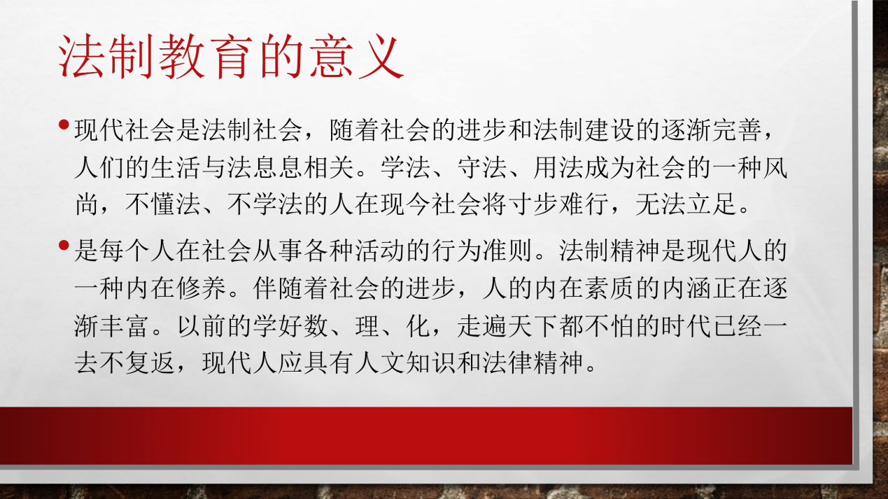 在班会上,班长通过列举由于不规范法律导致的不良行为和后果,让同学们思考和发表感想。同学们畅所欲言,积极回答。此次班会的目的是让同学们知法懂法,提高法治意识。