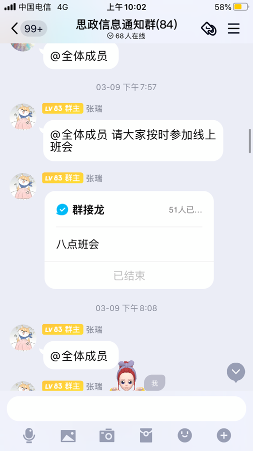 3月9日,2018级思想政治教育班召开线上班会。同学们通过线上途径进行签到。此次班会的主要内容是安全与法制教育。