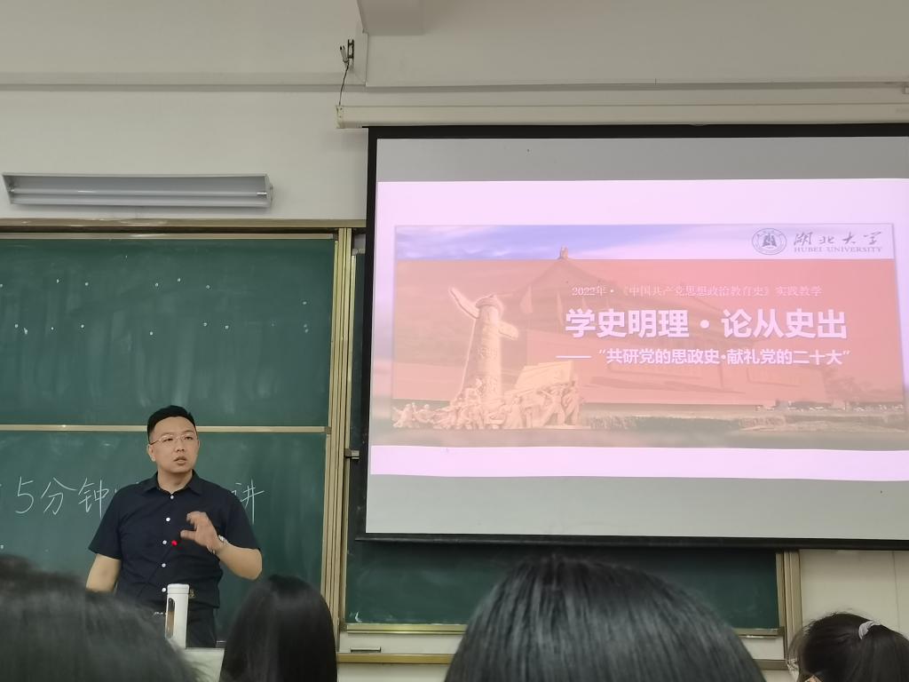 讲师王昊以其《中国共产党思想政治教育史》课程为载体, 组织2021级思想政治教育专业学生开展“学史明理,论从史出”特色实践课程。学生们以章节为单位,分为12组,选取经典案例,对党不同时期思想政治教育的经验、成果、教训进行综合研究,并在课堂上进行15分钟的展示汇报。