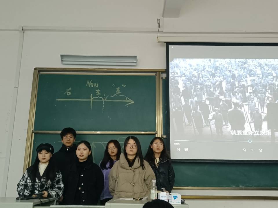 目前小组展示已进行到第五组,同学们各展所长,在思政课堂玩出了新花样,师生在一片欢声笑语中“学史明理”。21级赵倩、郑瑶瑶、严艺等同学或自主制作微电影展示土地革命时期的思想政治教育,或情景扮演胡适和李大钊还原“问题”与“主义”的论辩、或化身抗战时期的热血青年展现一个平凡人的思想转变历程。“在这次自主学习中,我和组员通力合作,提升了我的团结协作能力,并在搜集资料的同时,了解到一些课本之外的知识,更加深化了我对这门课程的理解。”第二组学生付方宇说。