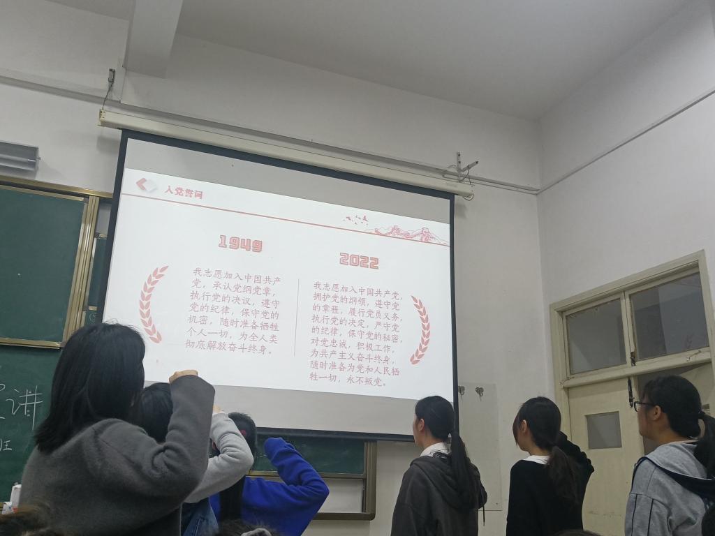 2021级思想政治教育专业学生郑筱桐和颜巧举起右拳,在庄严的配乐中,重温建国初期和十二大之后的入党誓词。