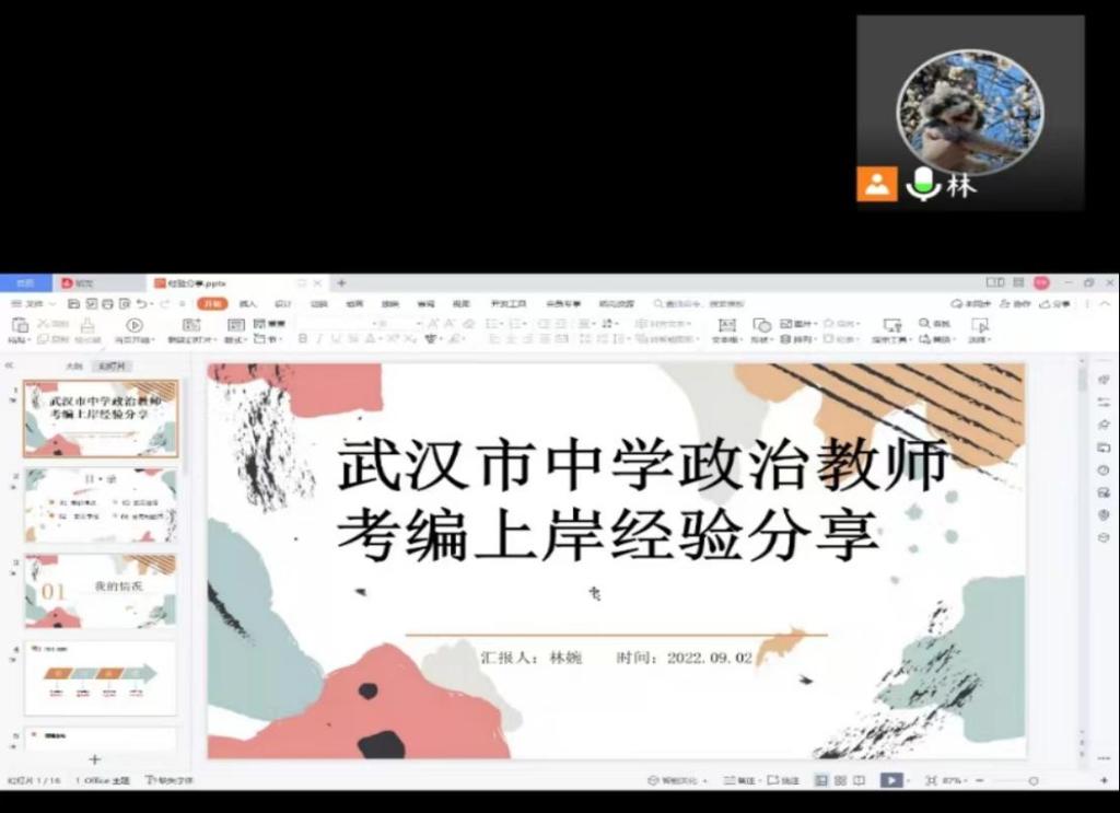 邀请2019级学科思政专业校友林婉在线开展武汉市教师编制考试经验分享会,并就2022年武汉市中学教师招聘形势进行分析。教育硕士专业学位负责人姚迎春副教授、20级和21级学科思政研究生共100余人参加此次分享会。分享会由姚迎春主持。