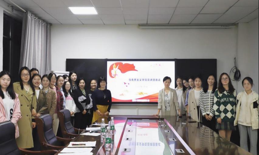 面试现场,同学们围绕学习贯彻习近平新时代中国特色社会主义思想和党的二十大精神开展宣讲,主要讲述了“党的创新理论”、“党史国史团情”、“国情形势政策”、“青年榜样故事”、“校史校情”等五个方面的内容。