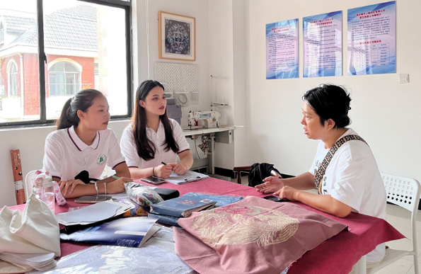 黄梅挑花又名架子花、十字挑花,不同于一般刺绣,刺绣重刺,挑花重挑。挑花图案以动物类图案最为常见,构思奇巧,布局均衡对称。7月17日,实践团队在黄梅挑花创客家园学习非遗“黄梅挑花”,切身感受挑花的魅力。创客家园的绣娘详细地讲述了黄梅挑花各种图案的寓意和各种针法,以及精美的挑花作品。走访过程中,成员们了解到,地方政府也出资、出台相关政策,培养绣娘,大力支持黄梅挑花的传承与发展,在当地车站内文化装饰、旅游景点、文创中心、博物馆等地,都能看到黄梅挑花的影子。
