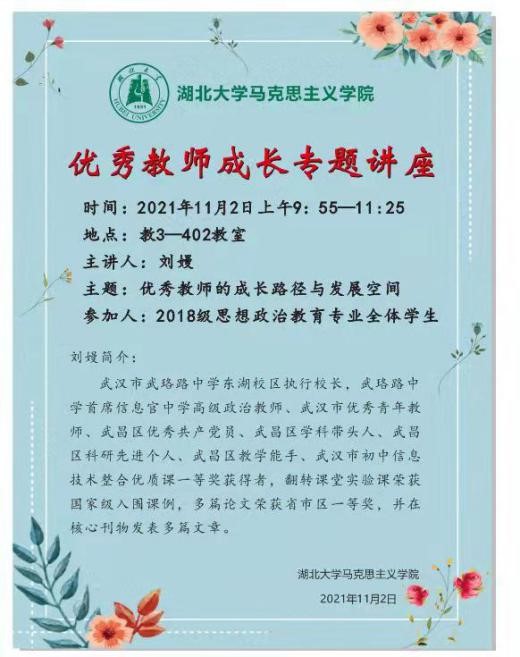 刘校长首先对武珞路中学的基本情况和个人履历进行了简明扼要的介绍,随后以自身多年执教经验出发,分别从成长为一名合格教师的过程和作为一名优秀教师必须具备的与时俱进的素质两方面展开了本次课程。课程内容翔实丰富,深受在座同学们的认可。