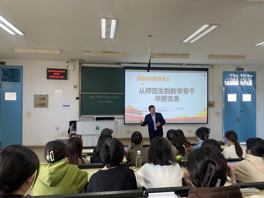 讲座伊始,沈朝平老师从“我们都是思想政治教育专业的师范生”展开。他提到,思政专业的同学们应肩负学政治、讲政治、教政治的使命与任务,具备志存高远、心怀天下、筑梦未来的格局与情怀。