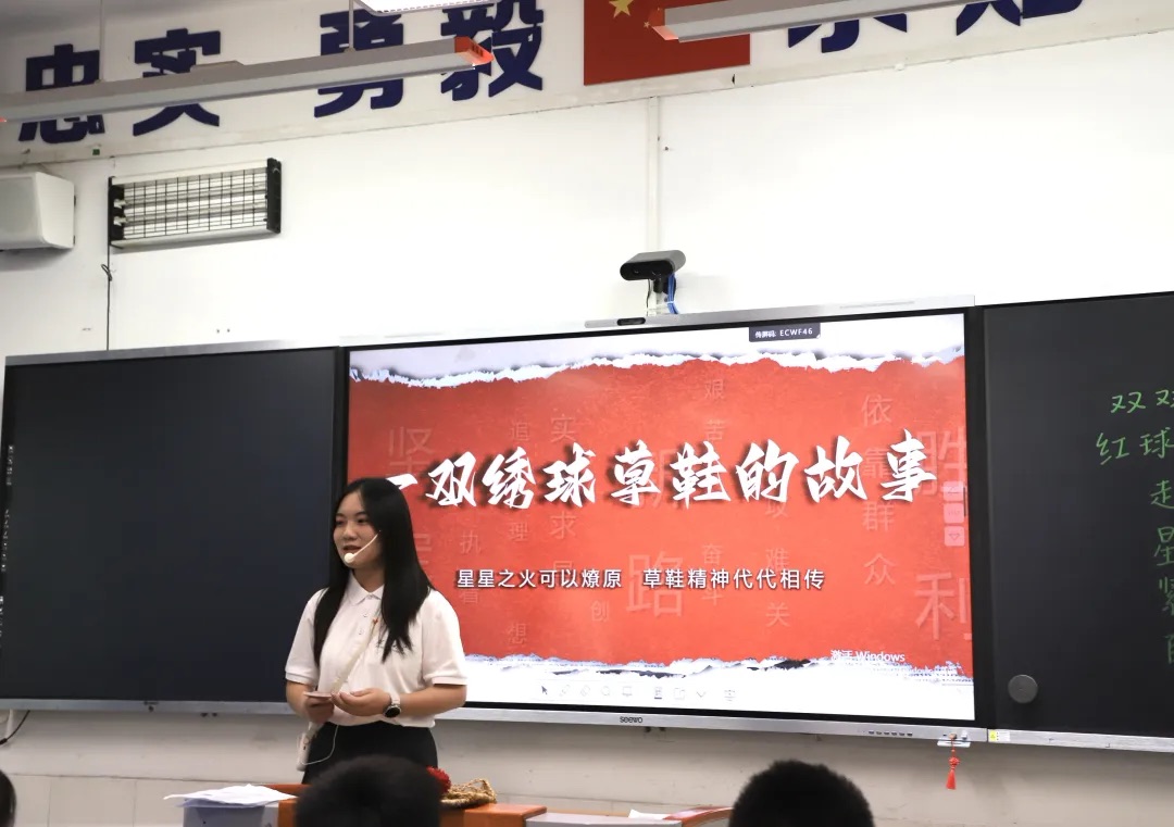 的社会实践团队走进湖大附中,为七年级学生呈现了一堂别具一格的沉浸式艺术思政课。课程以“一双绣球草鞋的故事”为线索,通过实物触摸、情景演绎和情感共鸣等多重方式,使红色历史生动地“走”进学生们的心田。