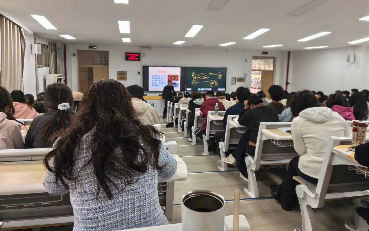 郭劲松教授讲授《中国近现代史纲要》课程中的“辛亥革命的爆发”相关内容。课堂上,郭劲松教授以“辛亥革命缘何成功”为切入点,凭借深厚的史学功底和丰富的教学经验,运用大量历史图片、文献档案以及地方史料,生动还原了武昌起义前湖北革命党人的活动轨迹。授课逻辑清晰、史论结合、情感充沛,将宏大叙事与细节考证巧妙融合,课堂反响良好。听课的老师们全程认真记录,从教学内容设计、教学方法运用、课堂呈现效果以及价值引领等方面进行了全面细致的观摩学习。