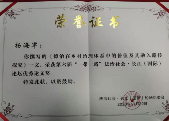 杨海军老师应邀参加,提交了会议论文:《德治在乡村治理体系中的价值及其融入路径探究》,被论坛学术委员会评为优秀论文。2020级研究生史娇艳、陈祥华、魏子云参加了本次国际论坛。