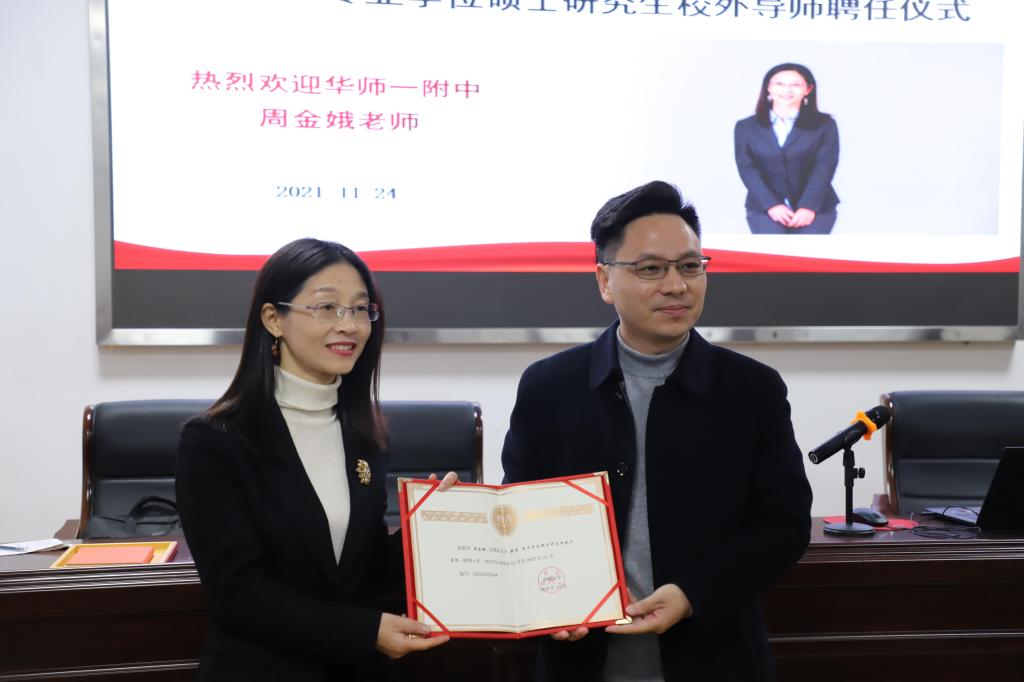 硕士专业学位校外导师聘任证书,并对周老师来院讲座表示热烈欢迎。
