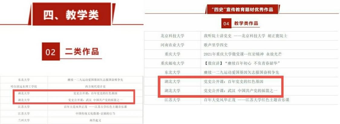 田子渝教授作品《党史公开课:武汉 中国共产党的摇篮之一》和王昊老师作品《党史公开课:百年党史中的红色基因》获教学类二类奖,并被评为今年活动特设的“四史”宣传教育题材优秀作品。