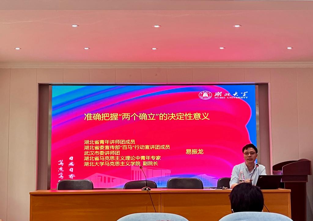 “两个确立”是新时代实现伟大变革的关键所在,是新征程上赢得未来的必然要求。宣讲会上,易振龙副院长从“历史经验”、“时代召唤”、“民心所向”三个方面,对“两个确立”的决定性意义进行深刻解读。宣讲会主题鲜明、视野宽阔、内涵丰富、深入浅出,既体现了深厚的理论素养,又融入了深邃的现实思考,具有很强的历史性、理论性,进一步深化了在座师生对“两个确立”的认识。