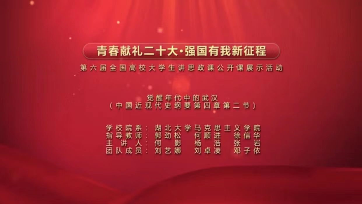 由郭劲松、何顺进、徐信华担任指导教师,何影、杨浩、张岩、刘艺娜、刘卓凌、邓子依等学生主讲的“觉醒年代中的武汉”在本次赛事中荣获一等奖。参赛团队以“中国近现代史纲要”课第四章第二节“马克思主义广泛传播与中国共产党诞生”的内容为基础,围绕武汉地区早期红色历史人物、革命历史事件,反复打磨教学稿件,采用行走的思政课的教学形式,以多个武汉红色革命遗址为场景,实地讲解了觉醒年代里武汉先进知识分子蜕变为马克思主义者,建立中共武汉早期组织,传播马克思主义以及组织发动学生运动和工人运动的史实,旨在促进青年大学生理解伟大建党精神、守好红色根脉、树立强国有我之志。