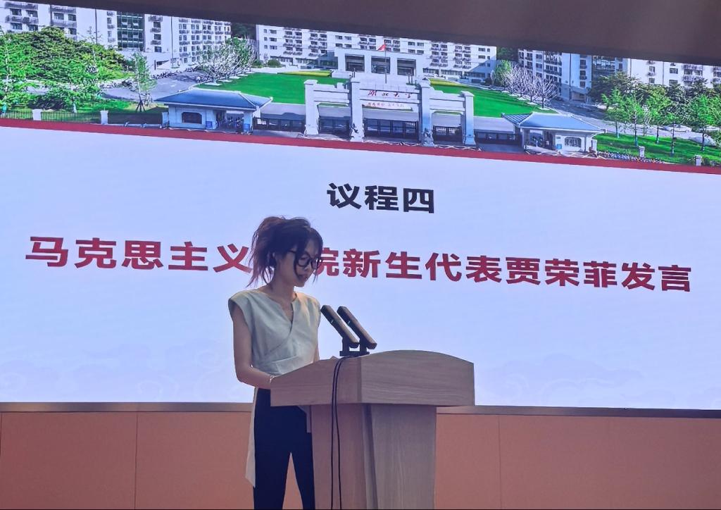 新生代表贾荣菲发言。她分享了对学习马克思主义理论的认识,号召大家始终保持对真理的追求和对理想的执着,用实际行动践行所学,并从三个方面分享了自己对研究生生活规划,勉励新生积极进取,担当重任。