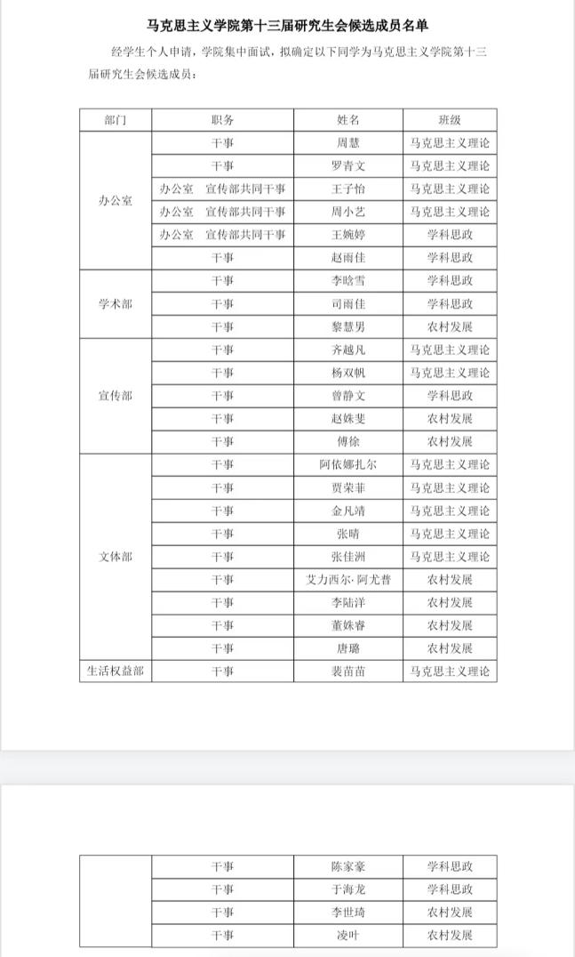 第十三届研究生会成员名单公示如下:任命2023级马克思主义理论专业杨昕怡、2023级马克思主义理论专业任泉、2023级农村发展专业艾克热木江·艾尔肯三位同学为马明星3缺1电脑版下载