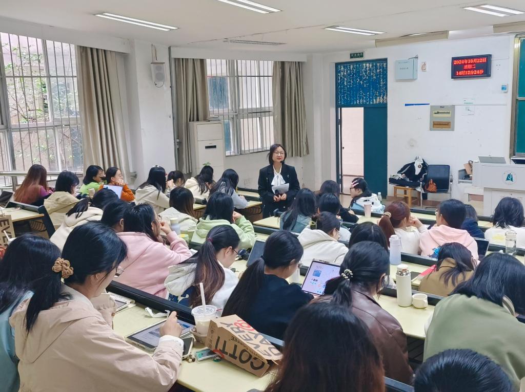 而后,杨倩老师强调了两个关键词“热爱”与“坚持”。“热爱”即对选择的岗位保持充分的激情。杨倩老师指出学校学历只是敲门砖,工作能力才是立身之本。杨倩老师鼓励同学们做一个“多面手”,探索培养自身多元能力以保持对岗位的热爱。杨老师结合自身外出学习经历提醒同学们不放弃任何一个学习机会,向网络学习、向优秀教师学习。